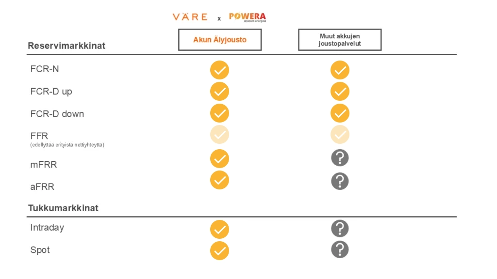 Ilman Väreen sopimusta Powera ÄLY -järjestelmä osallistuu FCR-D ja FCR-N markkinoille. Väreen sähkösopimuksen kautta akku voidaan kytkeä myös Intraday-, Day-ahead-, mFRR- ja aFRR-markkinoille, jolloin ansaitset huomattavasti parempia joustotuottoja.